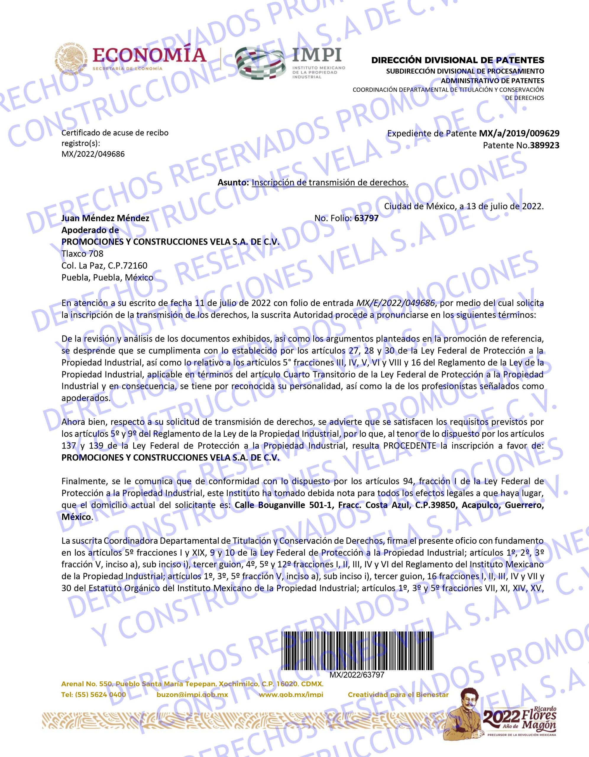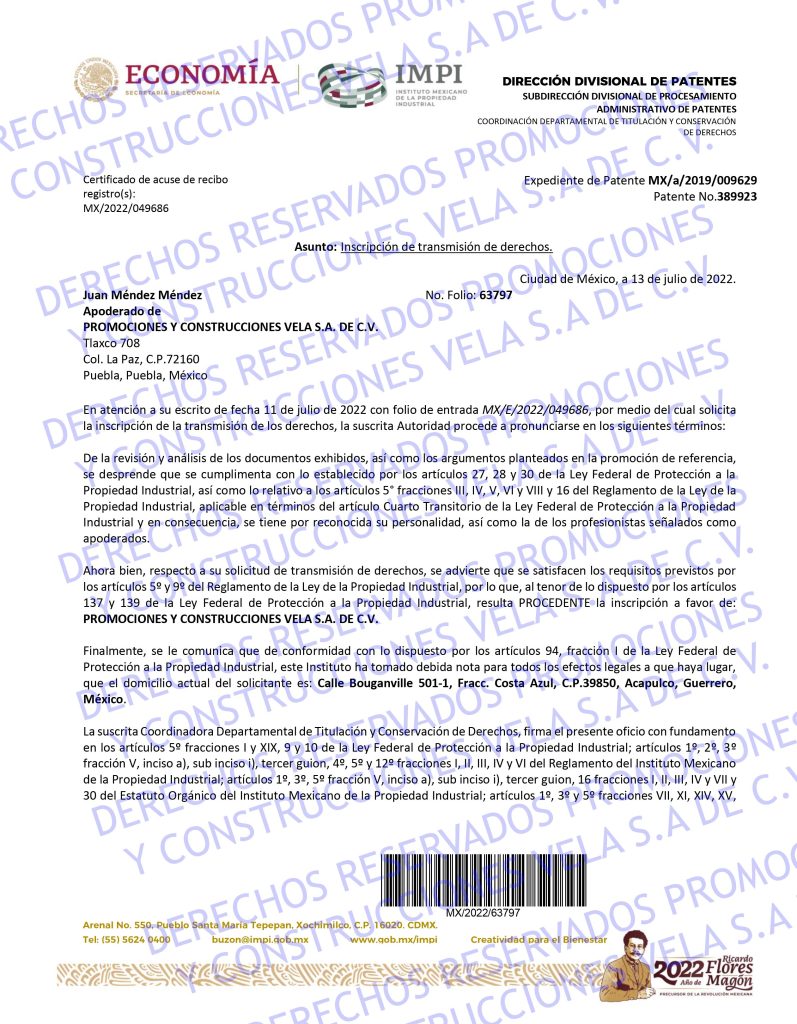 CONSULTE DIRECTAMENTE EN EL INSTITUTO MEXICANO DE LA PROPIEDAD INDUSTRIAL (IMPI) LOS DERECHOS DE PROPIEDAD INTELECTUAL DE Promociones y Construcciones Vela sa de cv SOBRE LA PATENTE MX/a/2019/009629 «TRATAMIENTO DE AGUA POR DOBLE NANO OXIDACIÓN» Y EVITE INCURRIR EN UN DELITO.